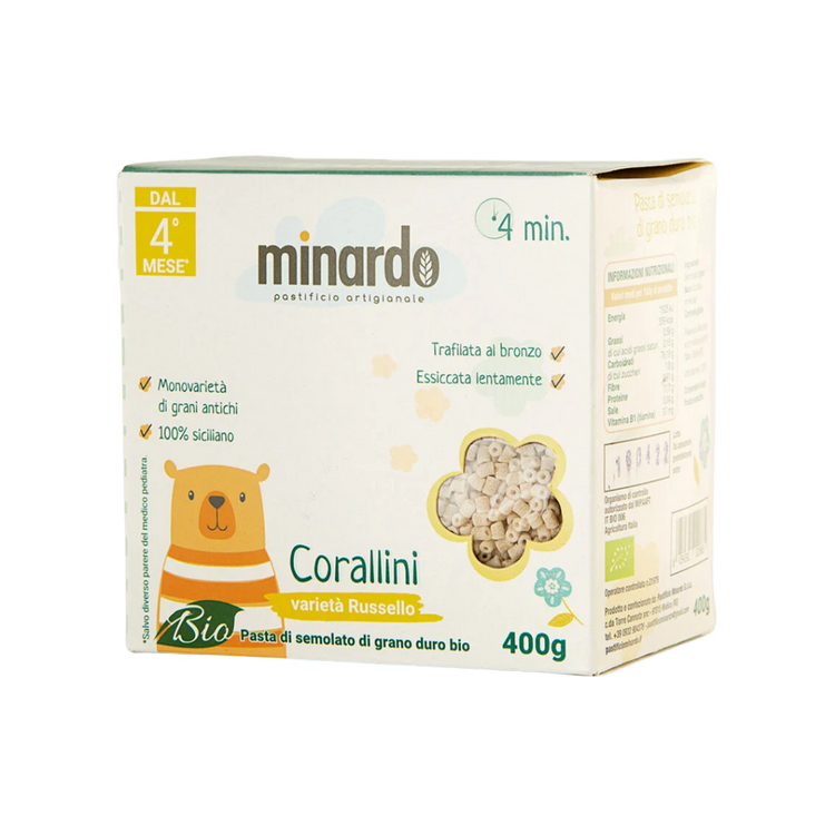 I Corallini Minardo sono una pasta biologica e artigianale, pensata specificamente per l'alimentazione dell'infanzia. Realizzati con semolato di grano antico Russello e acqua minerale pura, offrono un alimento genuino, ideale per accompagnare i primi passi nello svezzamento, a partire dal 4° mese.
