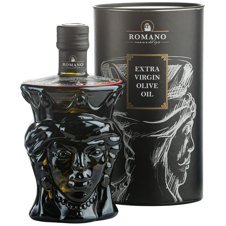 Olio extravergine d’oliva IGP Sicilia in bottiglie nere con la forma di teste di Moro. La stessa bottiglia rappresenta da un lato la donna e dall’altro l’uomo.