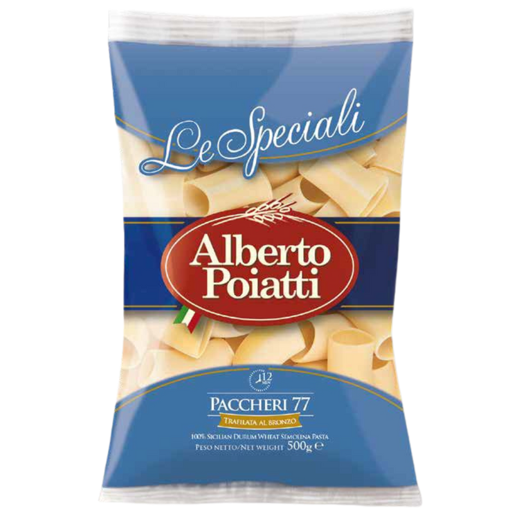 Realizzati con semola di grano duro di alta qualità e trafilati al bronzo, i Paccheri di Alberto Poiatti presentano una corposità e una rugosità particolare. Questa caratteristica permette alla pasta di trattenere al meglio i sughi, esaltando i sapori e le consistenze di ogni ricetta.