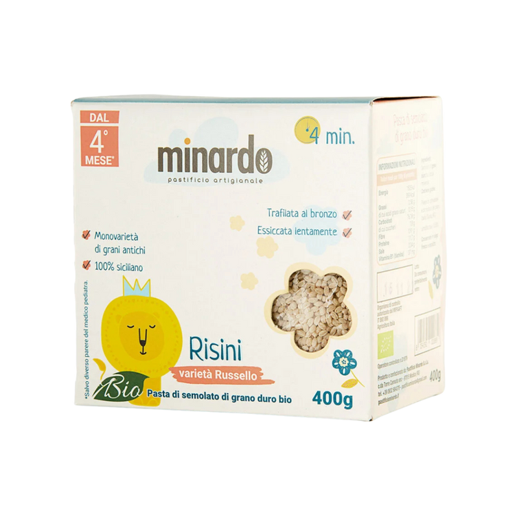 I Risini Minardo sono una pasta biologica e artigianale, pensata specificamente per l'alimentazione dell'infanzia. Realizzati con semolato di grano antico Russello e acqua minerale pura, offrono un alimento genuino, ideale per accompagnare i primi passi nello svezzamento, a partire dal 4° mese.