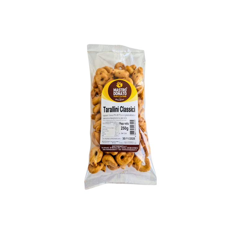 Semplici, croccanti e irresistibili: i Tarallini Classici rappresentano la tradizione pugliese in tutta la sua genuinità.