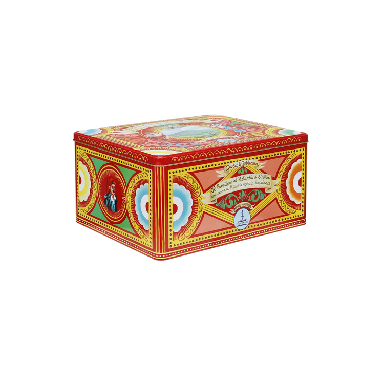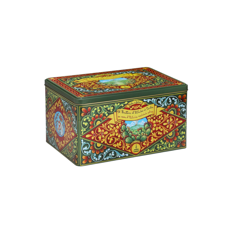 Il panettone viene conservato in latte speciali, decorate secondo la tradizione artistica siciliana, nella variante verde e rossa.