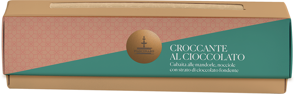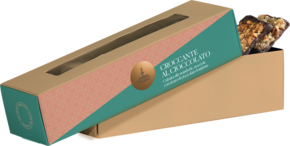 Dolce croccante alle mandorle, nocciole con strato di cioccolato fondente.