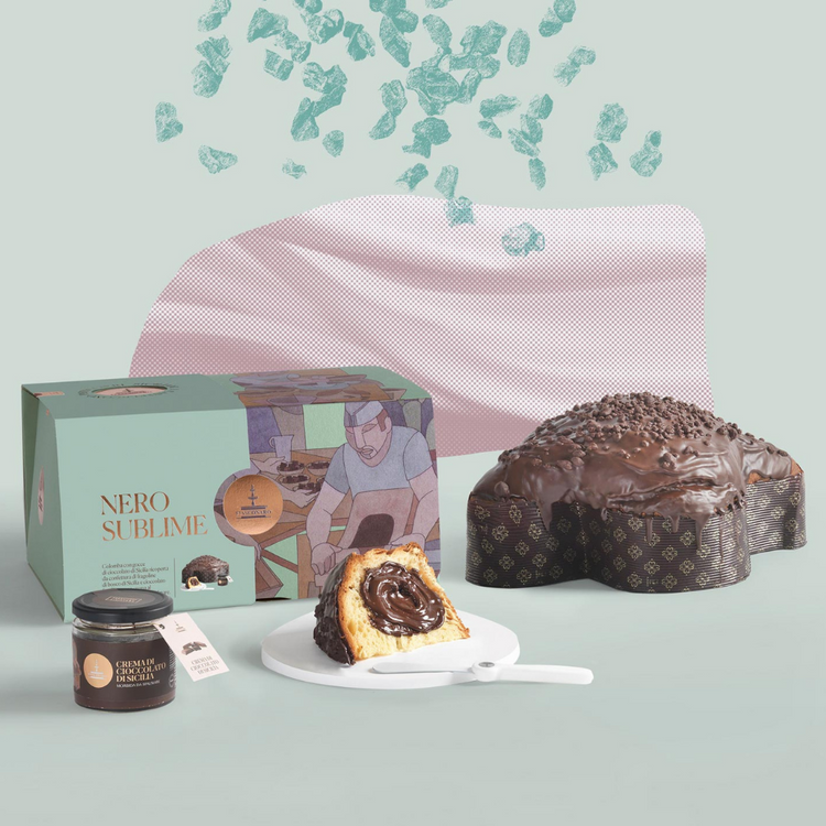 La Colomba Nero Sublime di Fiasconaro è il dolce perfetto per celebrare le festività pasquali in stile italiano, con gocce di cioccolato di Sicilia ricoperta da confettura di fragoline di bosco di Ribera (AG) e cioccolato fondente, con crema al cioccolato di Sicilia da spalmare.
