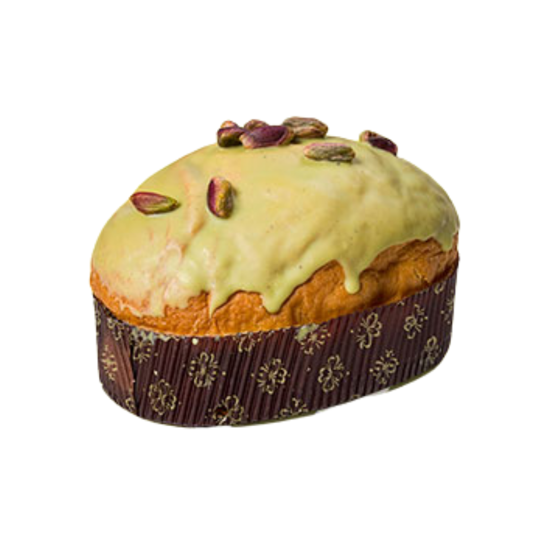 Farina di GRANO tenero tipo “0” e “00"" (GLUTINE), BURRO (LATTE), acqua, tuorlo d’UOVO ottenuto da uova fresche di categoria A, zucchero, purea di mela (cubetti di mele, sciroppo di glucosio-fruttosio, zucchero, correttore di acidità: acido citrico), lievito naturale di farina di FRUMENTO (GLUTINE), LATTE scremato in polvere, sale, farina di FRUMENTO maltato (GLUTINE), vaniglia Bourbon in polvere. Ricoperto con cioccolato di PISTACCHIO Siciliano 8,5% (burro di cacao, zucchero, LATTE scremato in polvere, PISTACCHIO Siciliano 6,5%, siero di LATTE in polvere, emulsionante: lecitina di SOIA, colorante: curcumina, clorofilla rameica; aromi naturali) e PISTACCHIO intero Siciliano 3,5%.