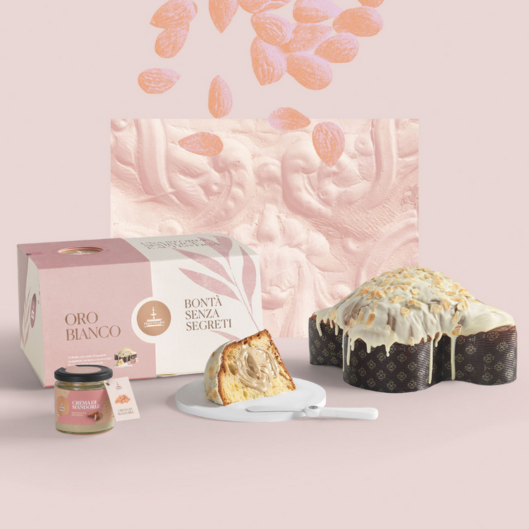 Der Colomba Oro Bianco von Fiasconaro ist dank der Glasur aus weißer Schokolade und Mandelblättchen sowie der cremigen Mandel-d'Avola-Creme zum Verstreichen ein wahrer Gaumenschmaus.
