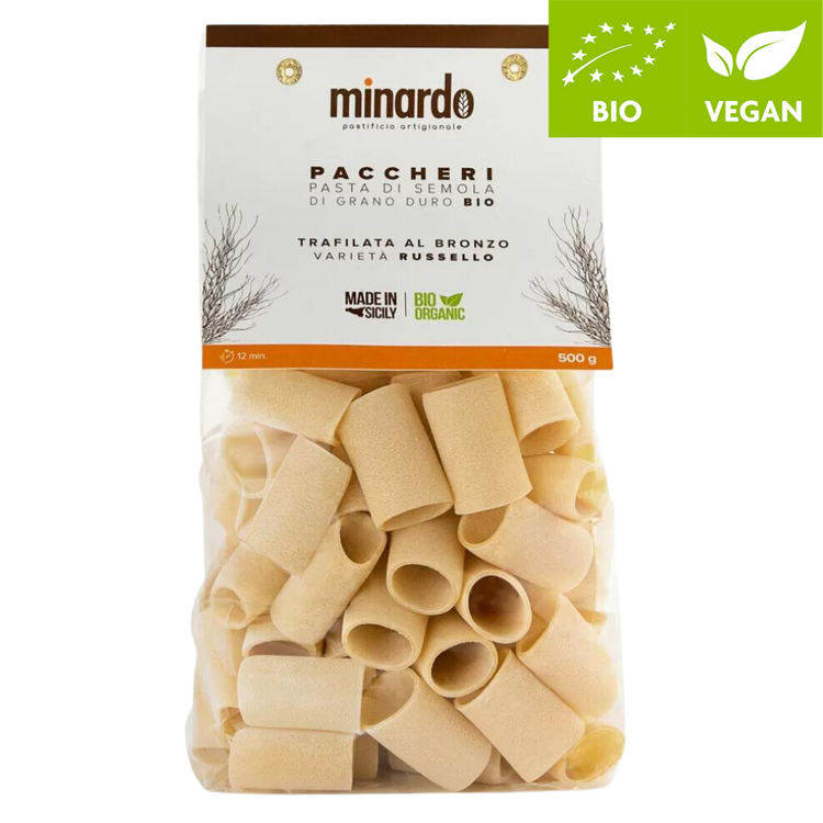 Pasta Minardo is made with 100% organic Sicilian ancient grain durum wheat semolina. Handcrafted in Sicily, with the highest quality raw materials, to guarantee a tasty, healthy and environmentally friendly product.
