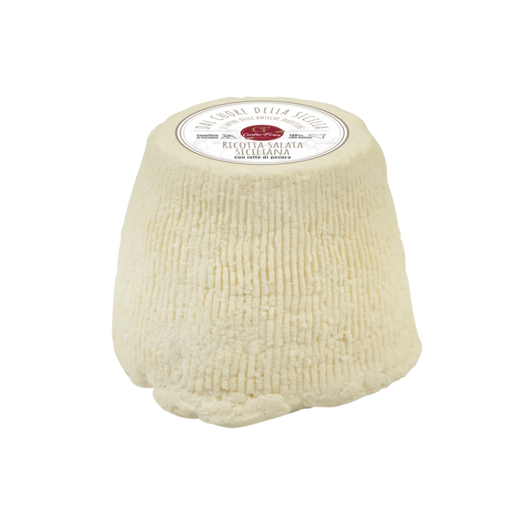 Ricotta salata di Pecora, a semi-hard dairy product, handmade with coarse sea salt.