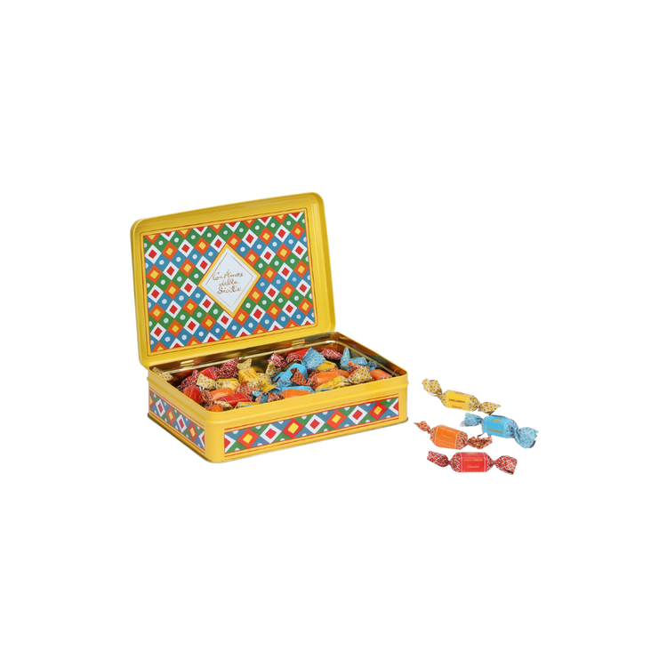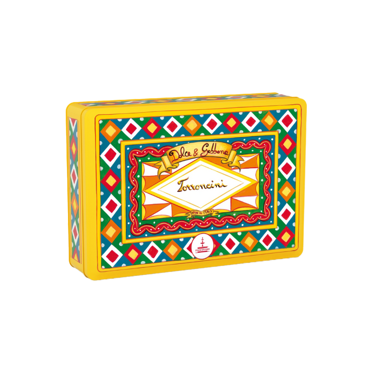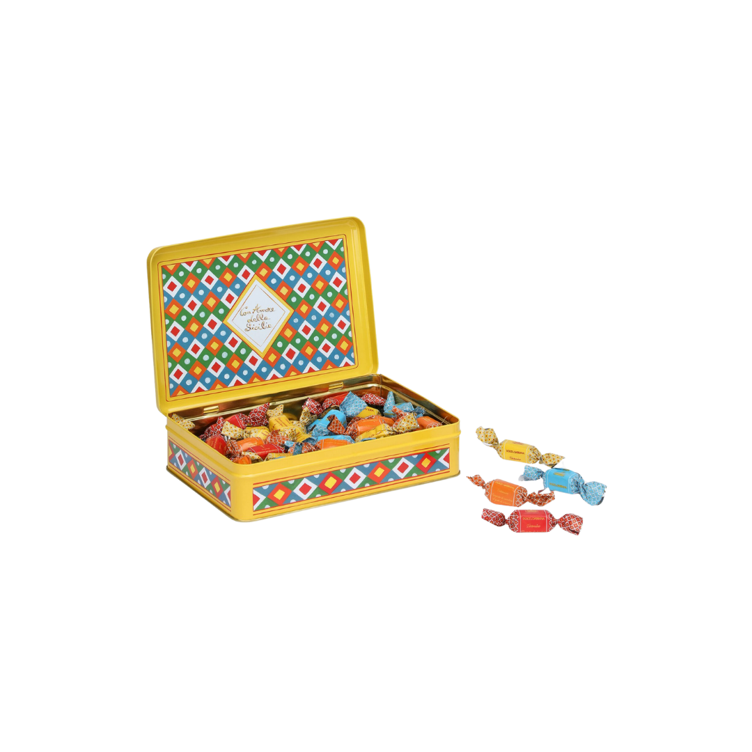 Packaged in tins decorated with Sicilian motifs, these soft sweets are available in three sizes: 150g, 250g and 500g.