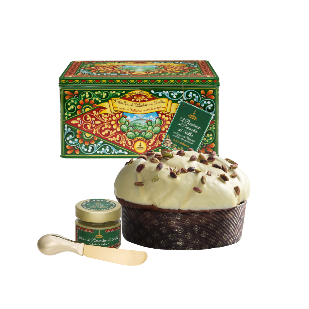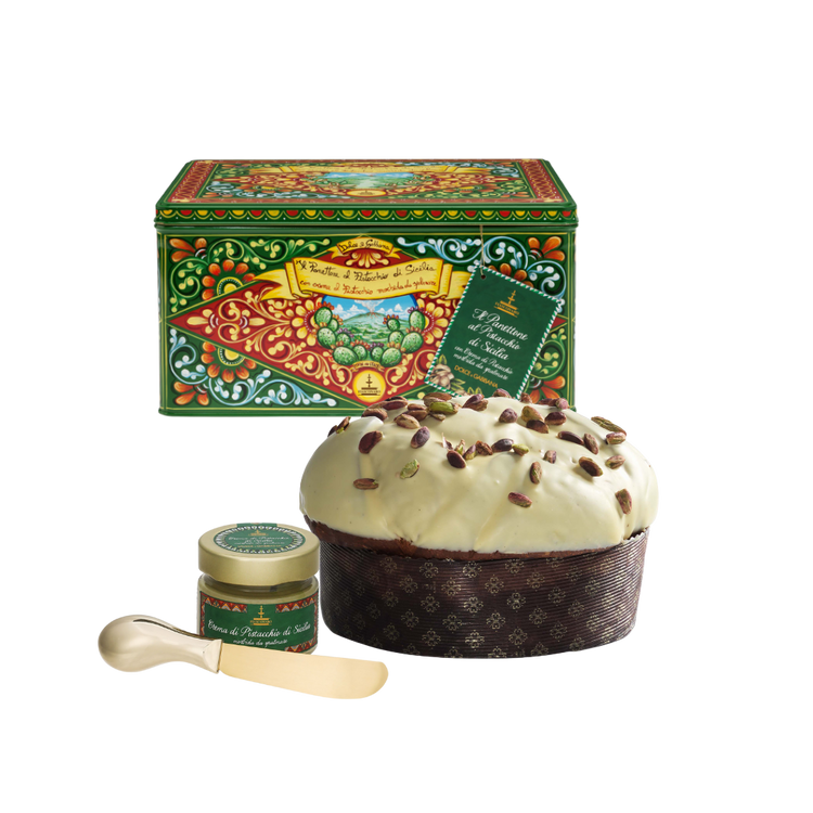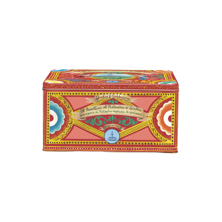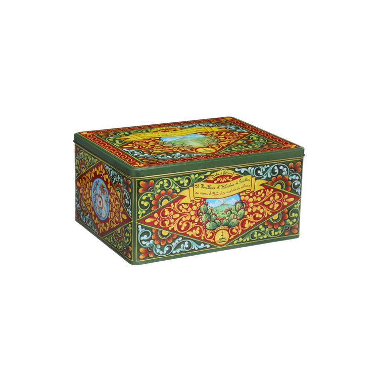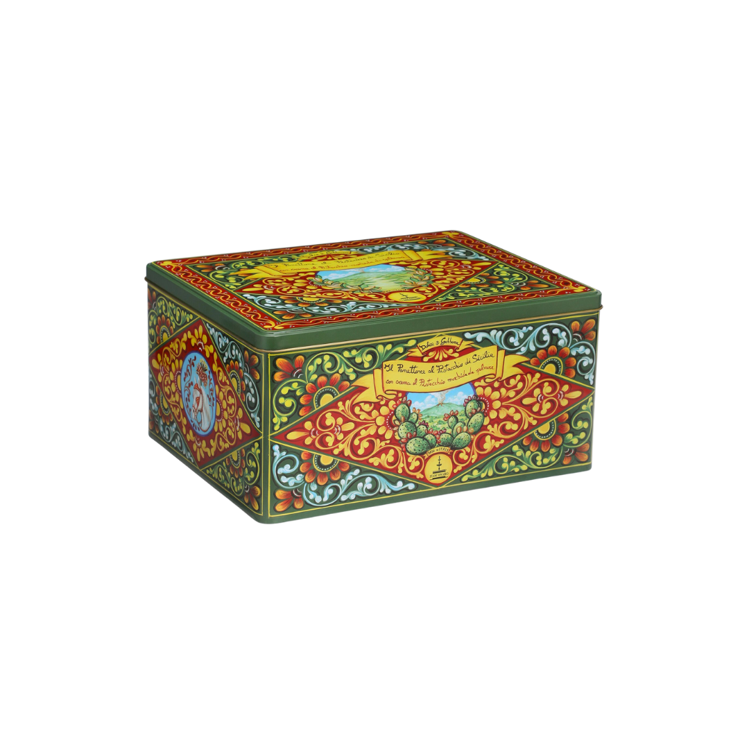 The panettone is stored in special tins, decorated according to Sicilian artistic tradition, in green and red variants.