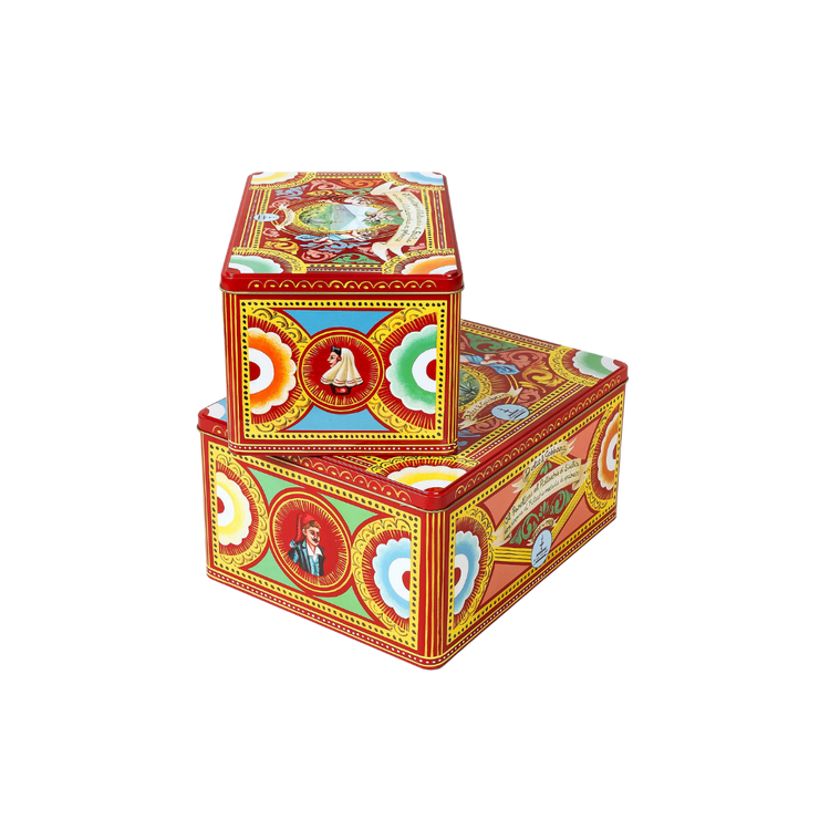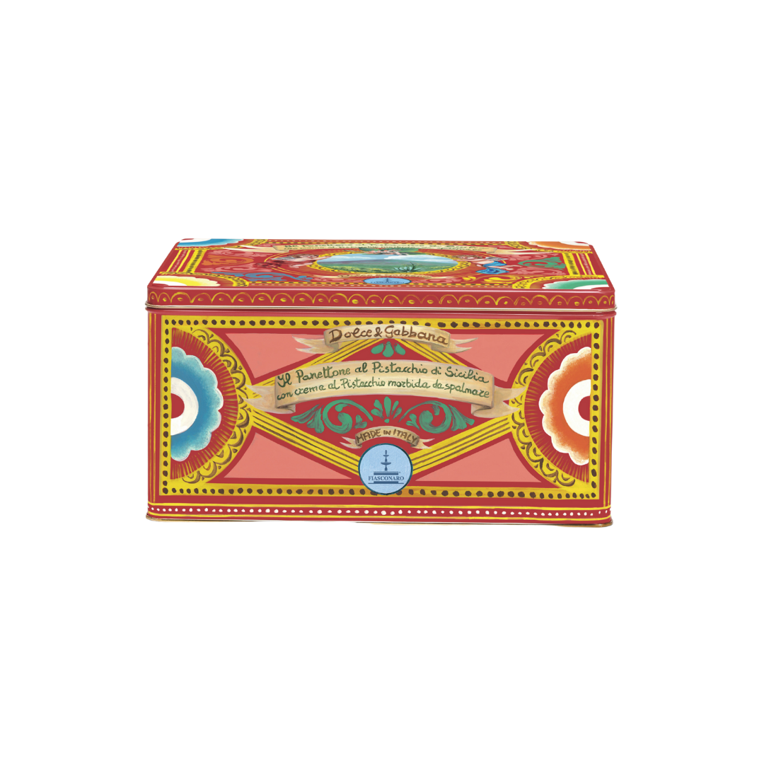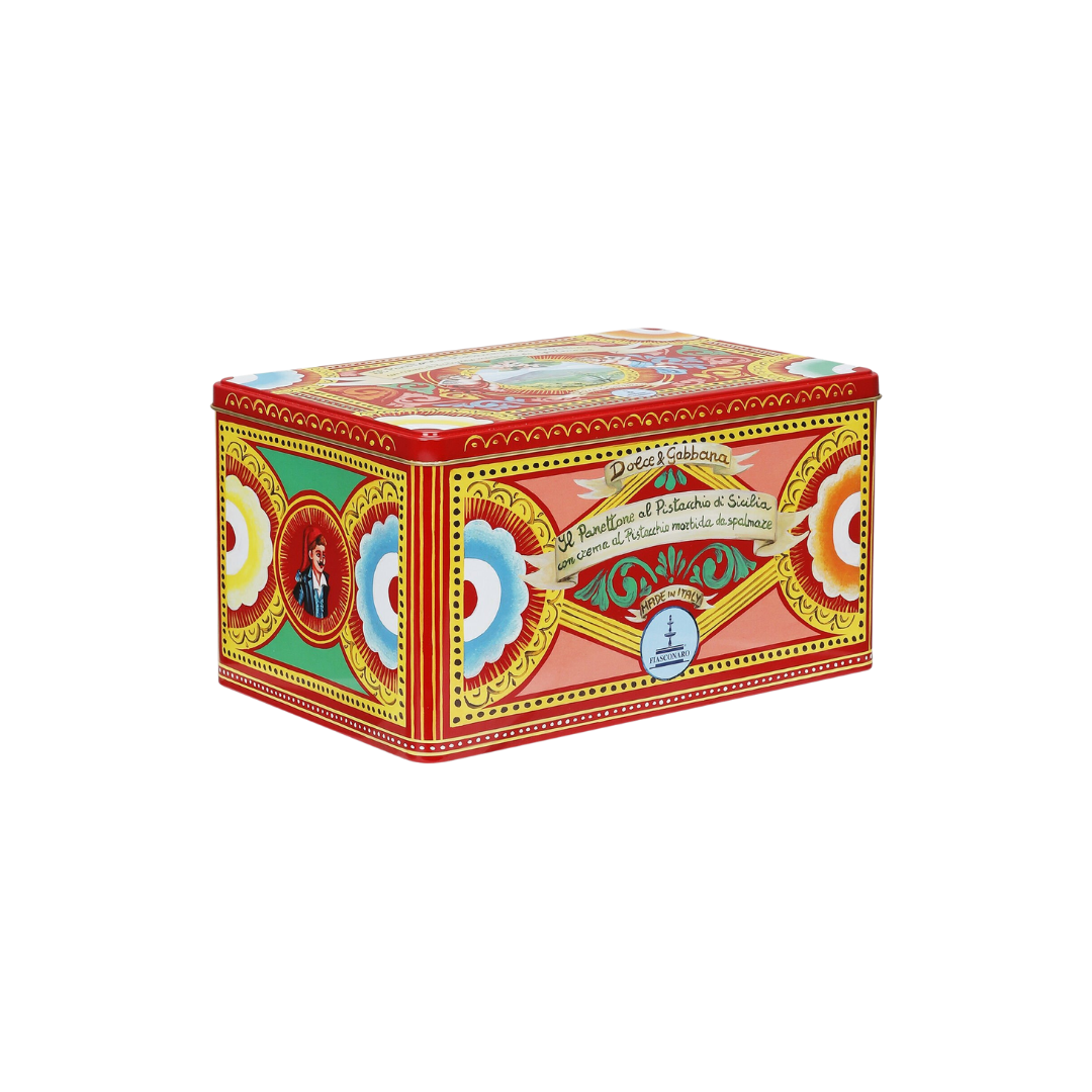 The panettone is stored in special tins, decorated according to Sicilian artistic tradition, in green and red variants.