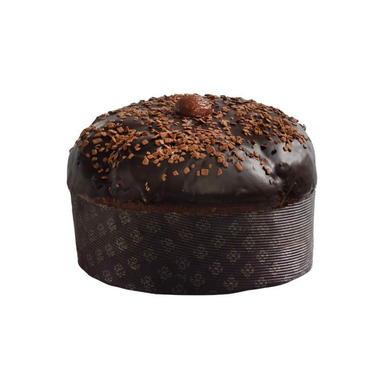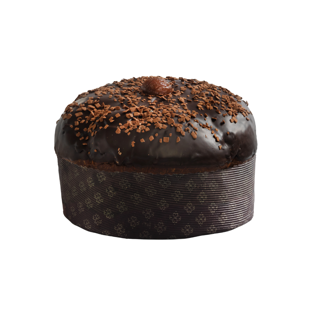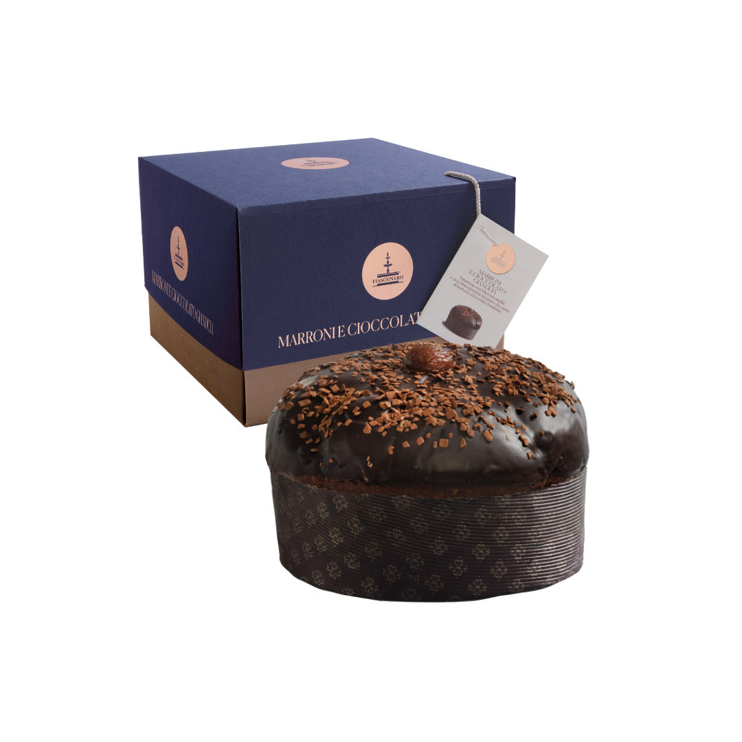 The naturally leavened dough contains candied chestnuts and gianduja chocolate, with a double glaze of dark chocolate and chestnut cream.