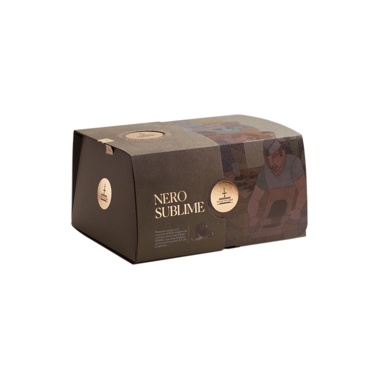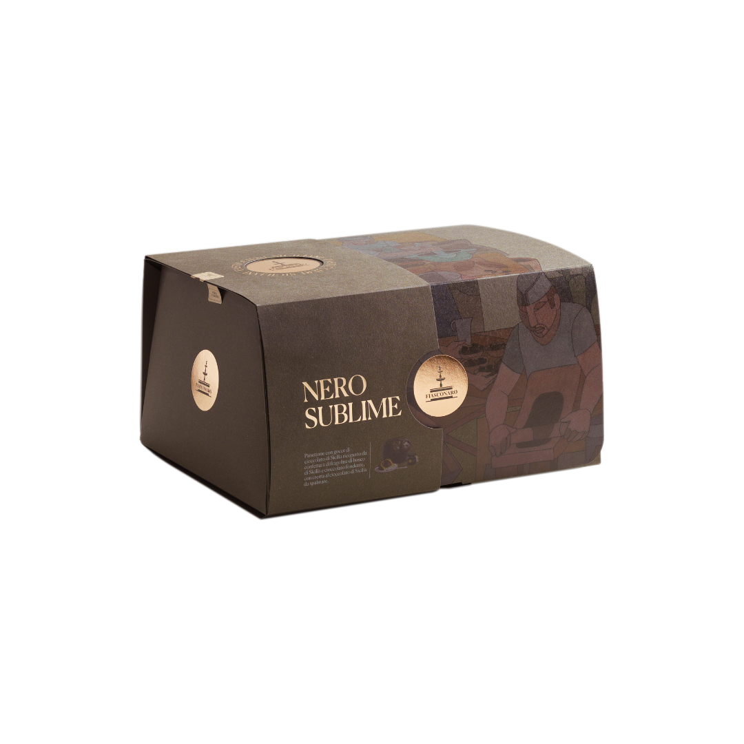 Black like the Sicilian chocolate "grains" inside, sublime in the double glazing: the dark chocolate envelops the delicate Sicilian wild strawberry jam.